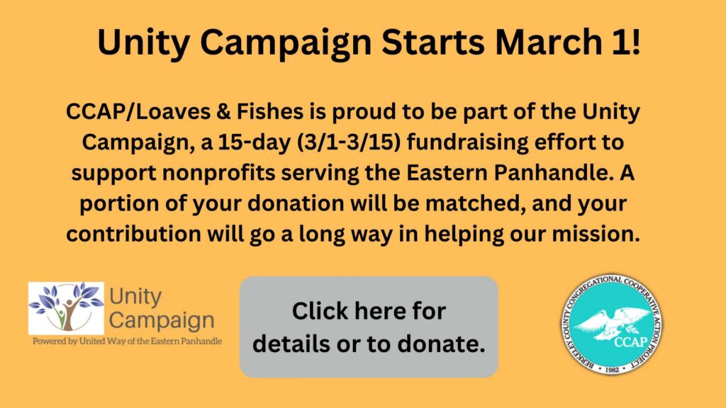 Berkeley County CCAP was founded in 1982 by representatives from sixteen Berkeley County churches who were looking for a way to help needy residents of Berkeley County. These church representatives came together and chartered CCAP hoping that by pooling their social outreach programs they could accomplish more together than each church could individually.